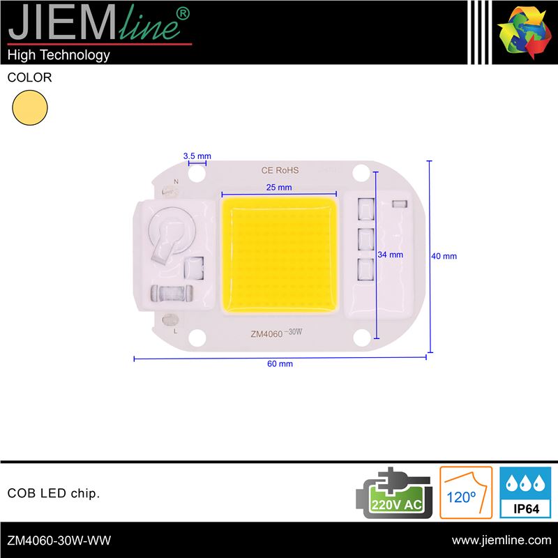 CHIP LED COB 30W 220~240V AC 3000K de alta calidad, montado en PCB de aluminio y alto brillo, apto para varios tipos de lámparas LED. No necesita LED driver ya que se conecta directamente a 220V ~ 240V AC, Este CHIP LED COB es de bajo consumo.