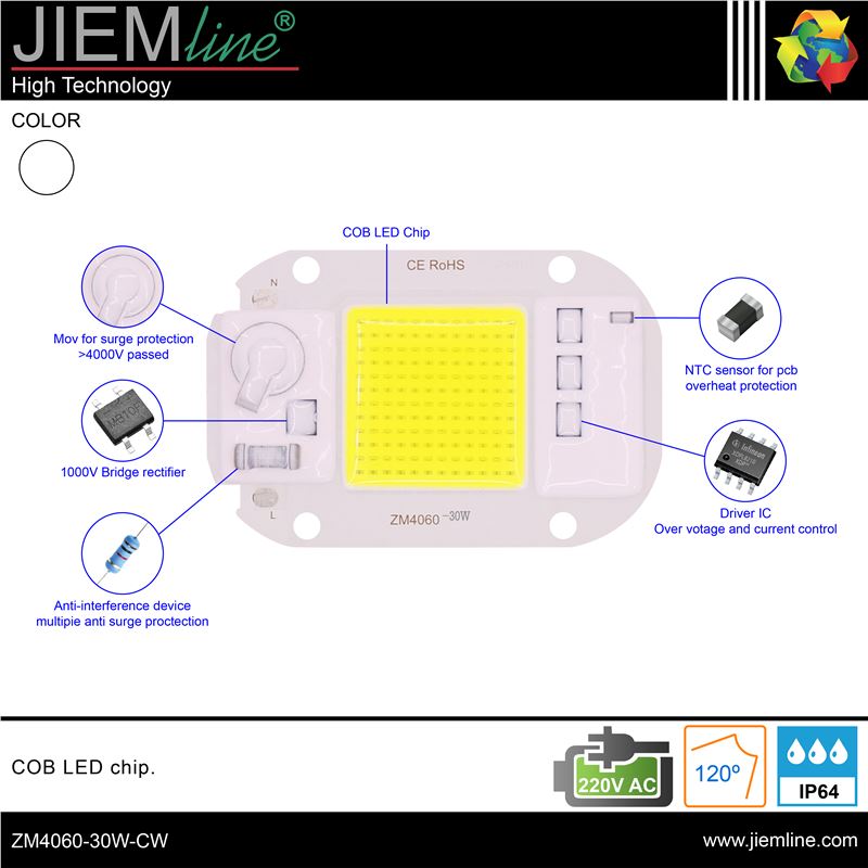 CHIP LED COB 30W 220~240V AC 6000K de alta calidad, montado en PCB de aluminio y alto brillo, apto para varios tipos de lámparas LED. No necesita LED driver ya que se conecta directamente a 220V ~ 240V AC, Este CHIP LED COB es de bajo consumo.