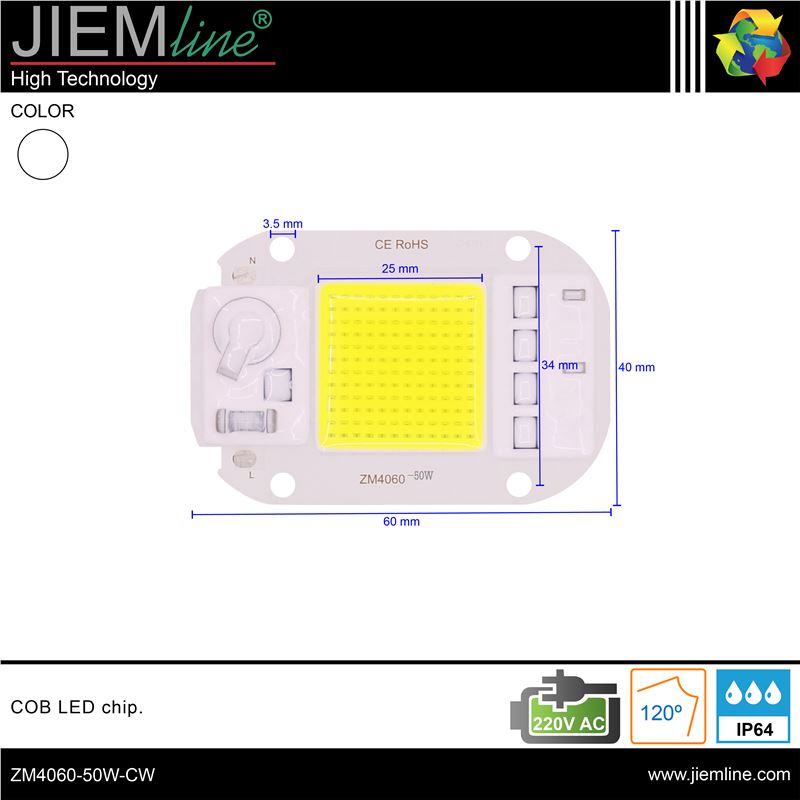 CHIP LED COB 50W 220~240V AC 6000K de alta calidad, montado en PCB de aluminio y alto brillo, apto para varios tipos de lámparas LED. No necesita LED driver ya que se conecta directamente a 220V ~ 240V AC, Este CHIP LED COB es de bajo consumo.