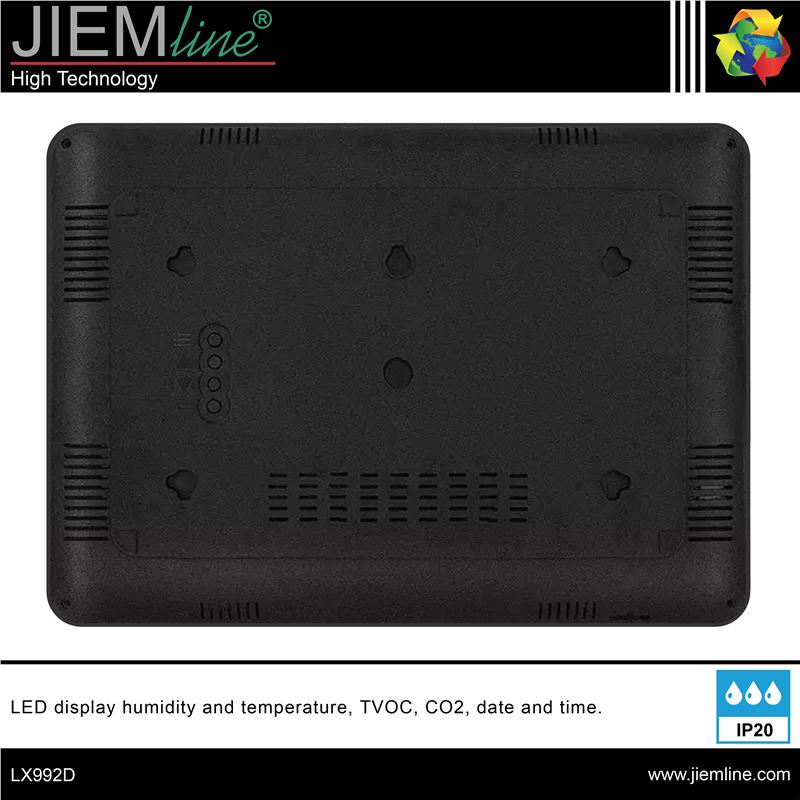 PANTALLA LED TEMPERATURA Y HUMEDAD, TVOC, CO2, de calidad profesional, ideal para medir y cumplir con el RD 14/2022 sobre ahorro energético que obliga a indicar la información sobre la temperatura y la humedad relativa del local. Este producto LED es de bajo consumo.