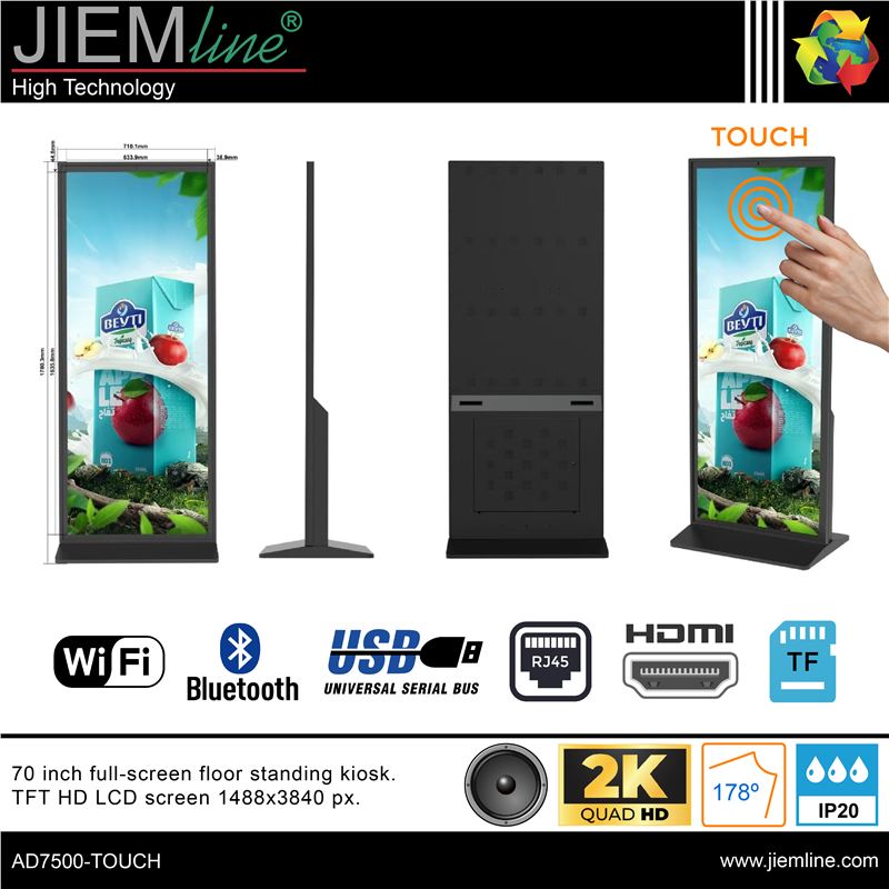 TOTEM VERTICAL PANTALLA LED LCD HD 70" TOUCH, de calidad profesional, este producto es muy adecuado para aplicaciones en espacios amplios, como supermercados, tiendas, estaciones de metro y otras áreas de exhibición comercial. Adopta una CPU industrial Android, que ofrece un rendimiento potente y capacidades de procesamiento de software robustas y de bajo consumo. Tiene un diseño ultrafino y superligero.