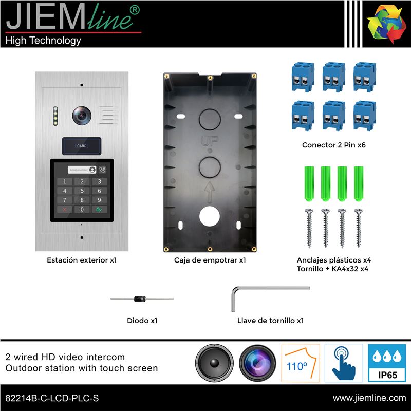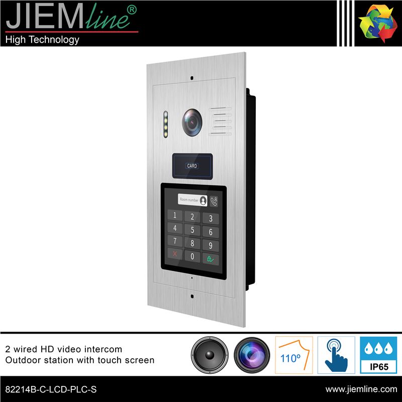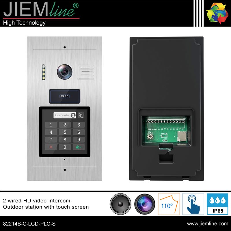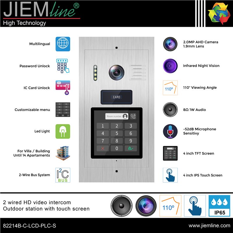ESTACIÓN EXTERIOR DE VIDEOPORTERO IC BUS PLC 2 HILOS, de calidad profesional, ideal para interiores y exteriores, sistema IC BUS de 2 hilos con protocolo PLC, de fácil instalación y configuración para la seguridad del hogar o de un negocio. Con pantalla táctil LCD de 4 inch. Cámara de 2MP y lentes de 1.9mm con apertura de 110º. Dispone de un sistema de audio bidireccional con un altavoz de 8 ohmios 1W y un micrófono con una sensibilidad de -52dB. El menú es configurable y multilenguaje, el acceso puede realizarse por medio de contraseña o tarjeta IC.
