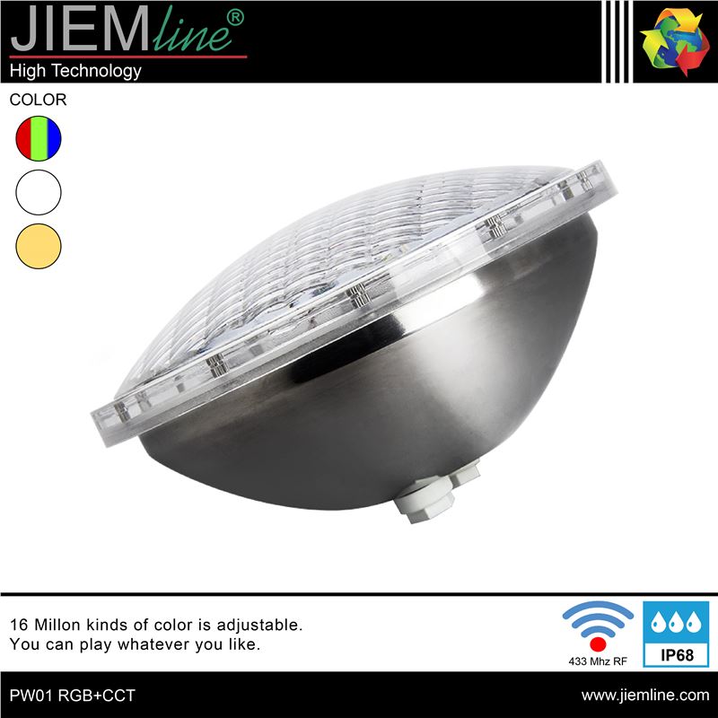 LÁMPARA LED PAR56 RGB+CCT, de calidad profesional, ideal para iluminar tus proyectos más exigentes, gracias a su tecnología RF 433Mhz te permitirá controlar y seleccionar a distancia con su control remoto o desde cualquier dispositivo móvil, el brillo, el ajuste CCT, el ajuste RGB hasta 16 millones de colores, o efectos lumínicos de gran belleza, integrándose perfectamente en los ambientes que desees. Este producto LED es de bajo consumo.