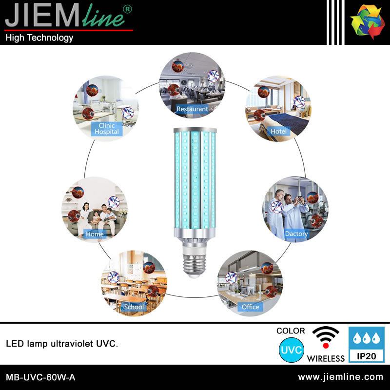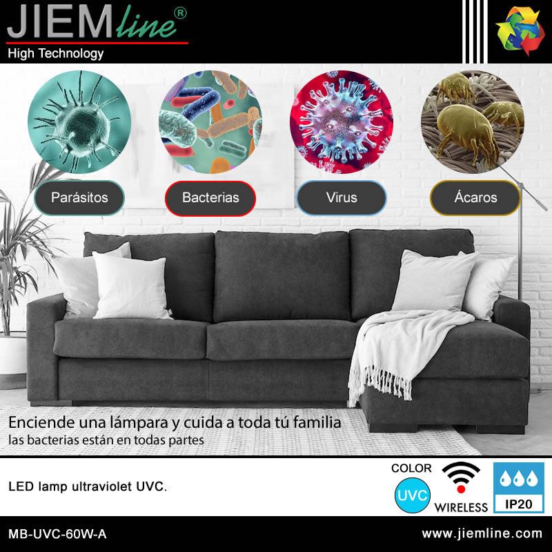LÁMPARA LED E27 UVC, de calidad profesional, ideal para desinfectar y esterilizar hasta un 99,9% de cualquier zona interior con máximo de 60 m2, gracias a su tecnología Wireless te permitirá controlar a distancia con su control remoto el tiempo de aplicación de la lámpara LED UVC, pudiendo seleccionar 30 / 60 minutos de acción, una vez finaliza el tiempo seleccionado la lámpara LED UVC se apagará automáticamente, también dispone de botón ON / OFF, protege a tu familia y tu negocio, la luz UVC rompe el ADN de los párasitos, bacterias, virus y ácaros, también destruye los malos olores. Este producto LED es de bajo consumo.