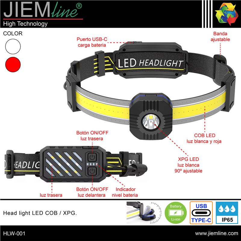 LINTERNA CABEZA LED XPG / COB, de calidad profesional, ideal para iluminar de noche o en zonas oscuras para el trabajo, en la pesca, de camping o haciendo senderismo, etc..., la banda delantera emite luz blanca y roja, el central emite luz blanca, y en la parte trasera dispone de una baliza que emite luz blanca y roja. Este producto LED es de bajo consumo.