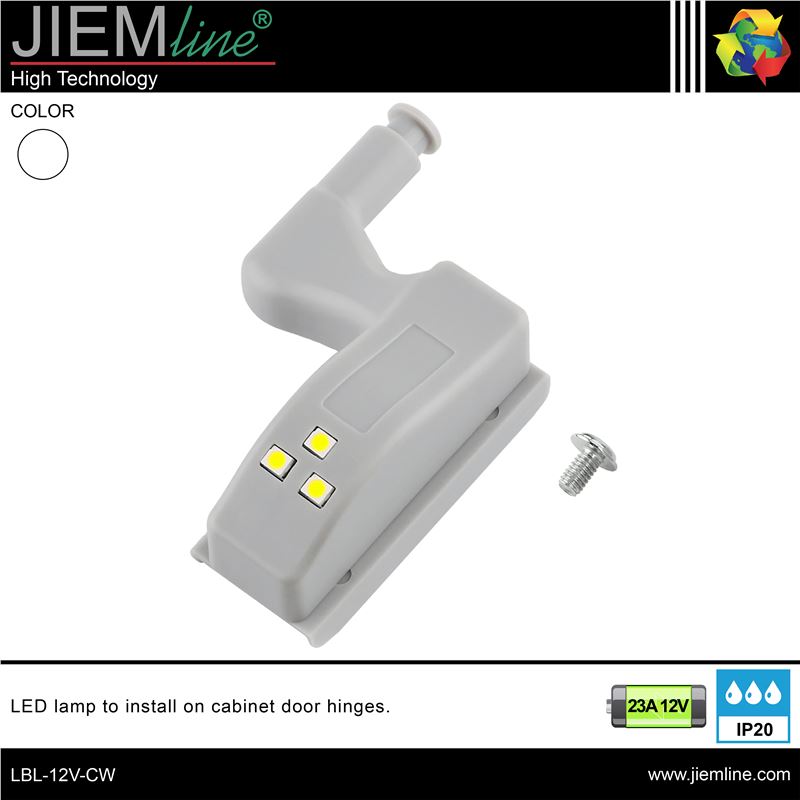 LUZ LED BLANCO CÁLIDO PARA BISAGRA DE ARMARIO, de calidad profesional, ideal para iluminar el interior de armarios y vitrinas, al abrir la puerta, la lámpara LED se enciende automáticamente, al cerrar la puerta, la luz se apaga. Este producto LED es de bajo consumo.