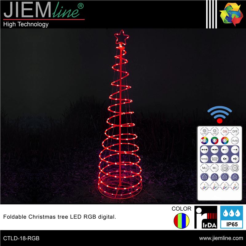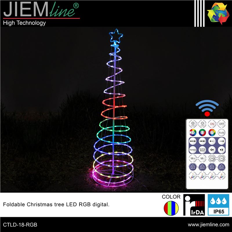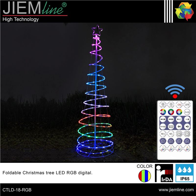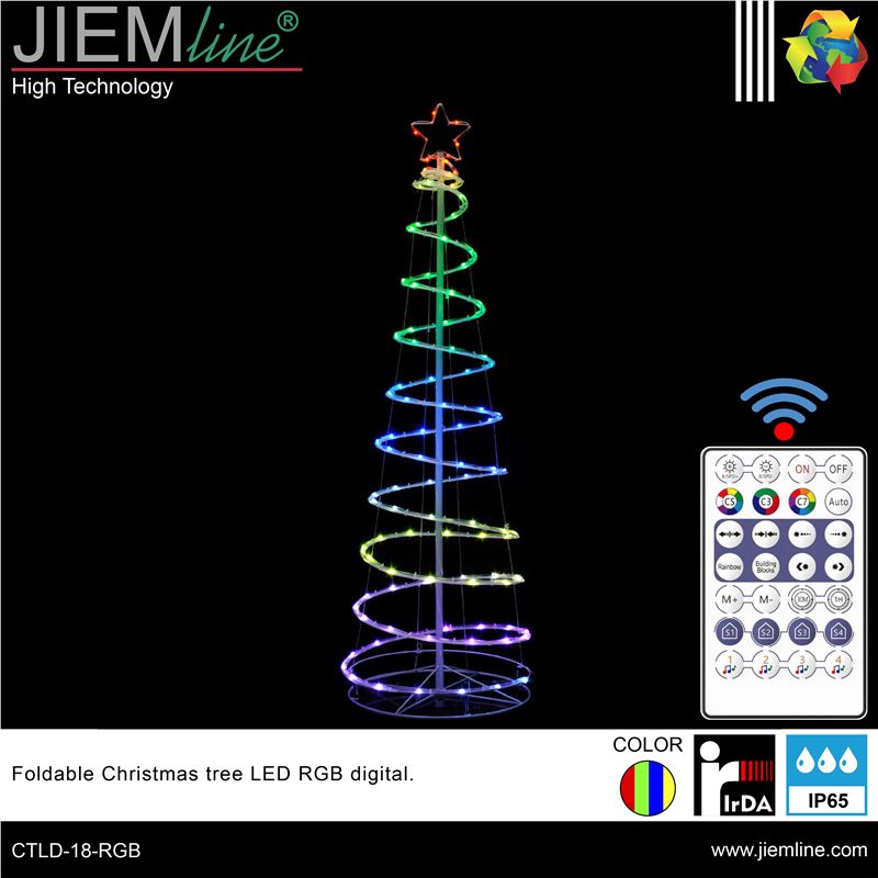 ARBOL PLEGABLE LED RGB DIGITAL, de calidad profesional, de uso interior y exterior, ideal para zonas internas y exteriores como jardines, calles y plazas para colocar en épocas de Navidad, los chips LED de este producto son RGB digital, y con el control remoto incluido y la App Surplife podrás crear efectos lumínicos de gran belleza, integrándose perfectamente en los ambientes que desees. Este producto LED es de bajo consumo.
