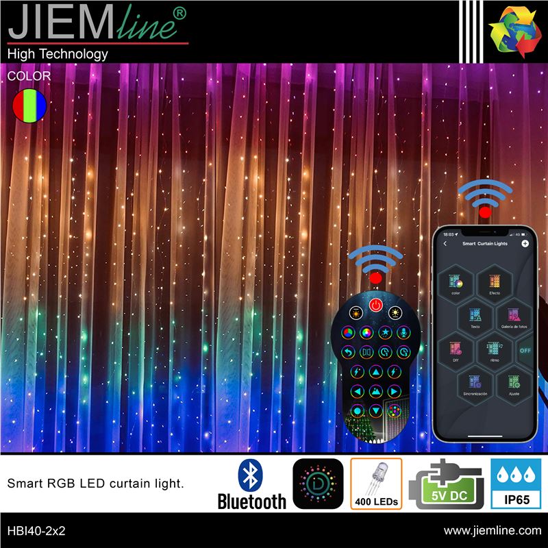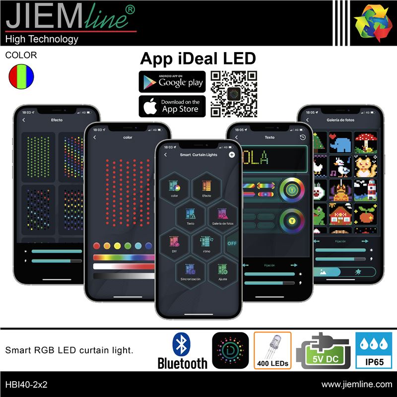 CORTINA LED RGB 2x2m / 400 Leds BLUETOOH, de calidad profesional, ideal para cubrir paredes y ventanas para colocar en épocas de Navidad u otros eventos especiales, gracias a sus LEDs digitales y a su tecnología Bluetooh y con la App iDeal LED, o con su control remoto, te permitirá controlar los diferentes colores de luz o efectos lumínicos de gran belleza, incluso al ritmo de la música, integrándose perfectamente en los ambientes que desees. Este producto LED es de bajo consumo.