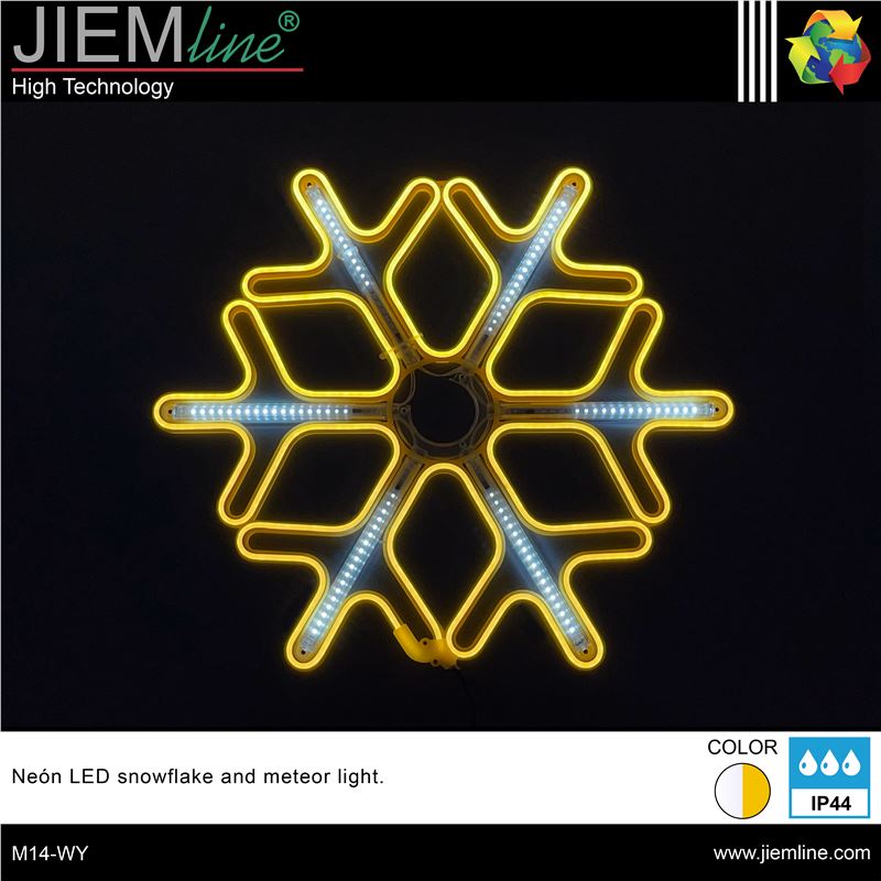 COPO NIEVE 2D NEÓN LED WY, de calidad profesional, de uso interior y exterior cubierto, ideal para cubrir fachadas, para colocar en épocas de Navidad u otros eventos especiales, este producto tiene un color fijo en neón amarillo, también dispone en su interior de 6 meteoritos blanco frío, creando efectos lumínicos de gran belleza, integrándose perfectamente en los ambientes que desees. Este producto LED es de bajo consumo.
