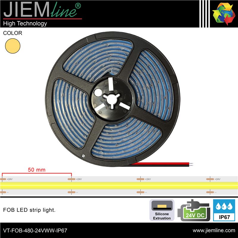 TIRA FOB LED BLANCO CÁLIDO IP67, de calidad profesional, y de ultima generación, permite una iluminación lineal sin puntos oscuros gracias a sus 480 micro chips LED por metro, este producto es ideal para instalar en cualquier zona de uso exterior o zonas húmedas, integrándose perfectamente en los ambientes que desees. Este producto LED es de bajo consumo.